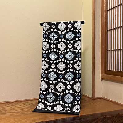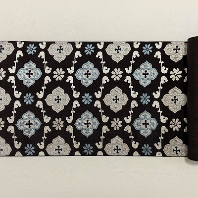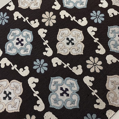 約300年前に中央アジアからトルコ・中国などを経由して伝承された「鍋島緞通」の柄をモチーフに、洛風林独自の配色とデザインで仕上げられた名古屋帯「花十字」