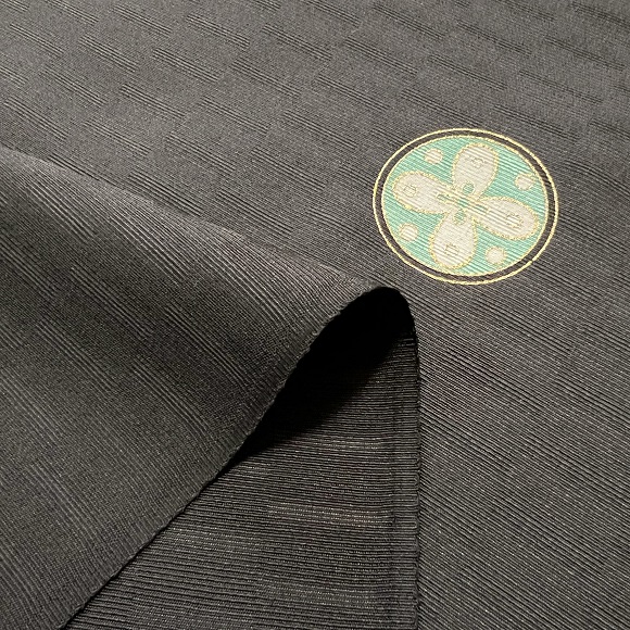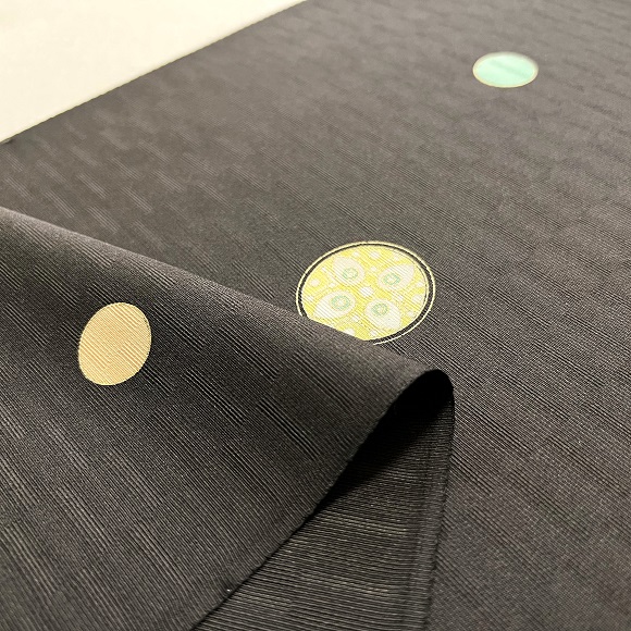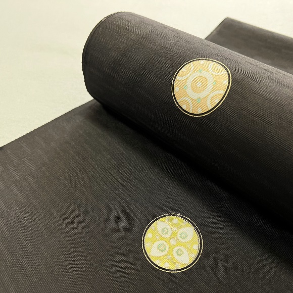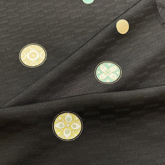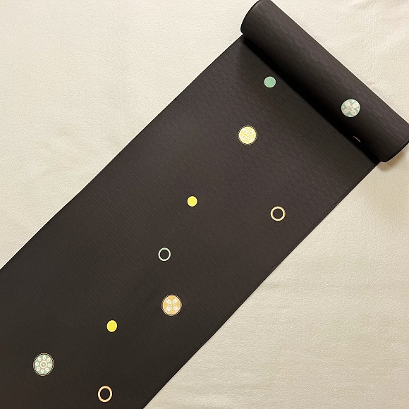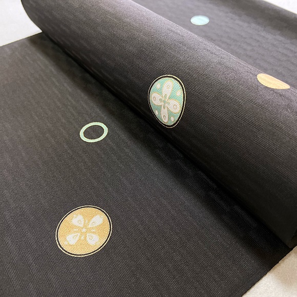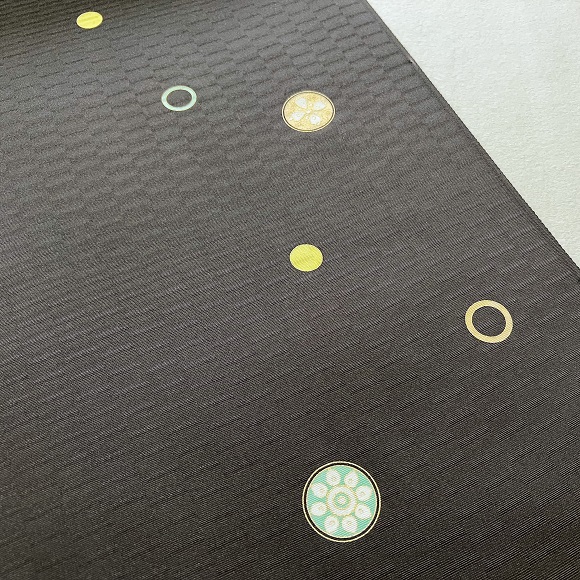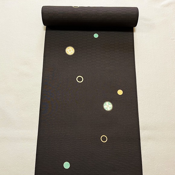上質な影織り地を墨茶色に染め、宝輪柄を散らした小紋です。