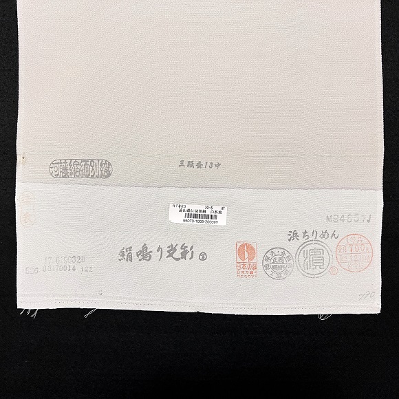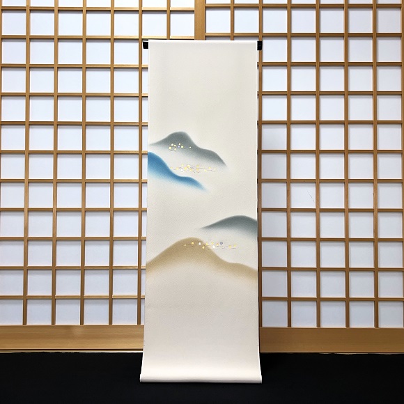上質な浜ちりめん地を薄白茶色に染め、遠山と切箔縫いを散らした付下げです。