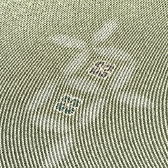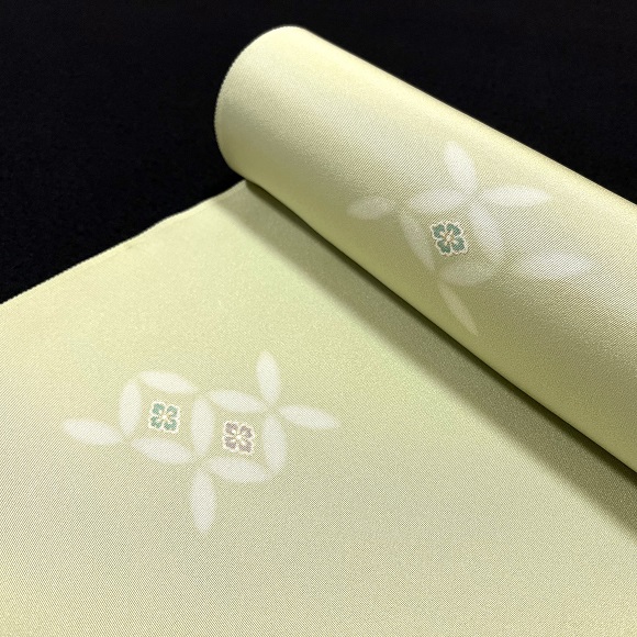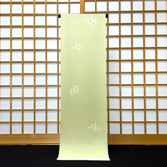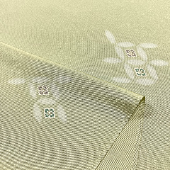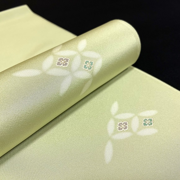 上質な白生地「凛」を若草色に染め、七宝と花菱を散らした小紋です。