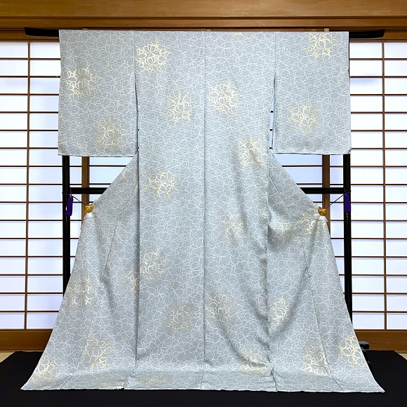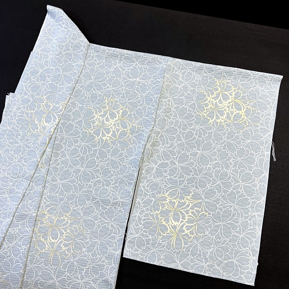 そして良くお問合せいただく事なのですが、こちらの商品は未仕立てでございます。簡単な仮仕立てで撮影をした後に、直ぐ解き湯のし・筋や汚れの地直しをして反物状態に戻しております。現在は販売し易いように仮絵羽にしております。