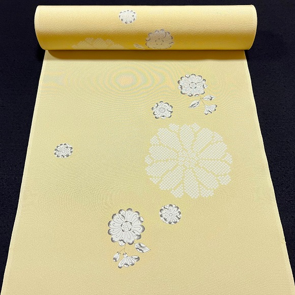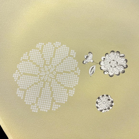 上質な浜ちりめん地を薄黄色に染め、菊の柄を配した小紋です。
