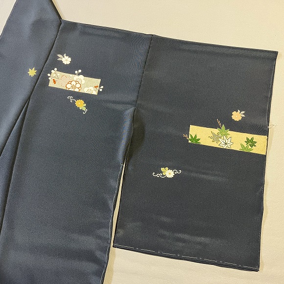 四季の草花と有職文様を手描きや染疋田で表しておりまして、別染めで八掛も付けて仮絵羽しておりますので訪問着としてお召いただいても良い逸品でございます。