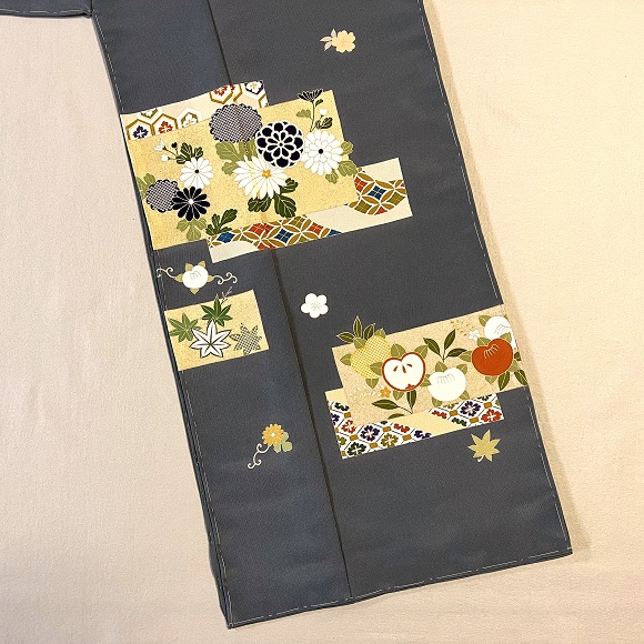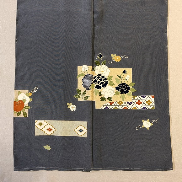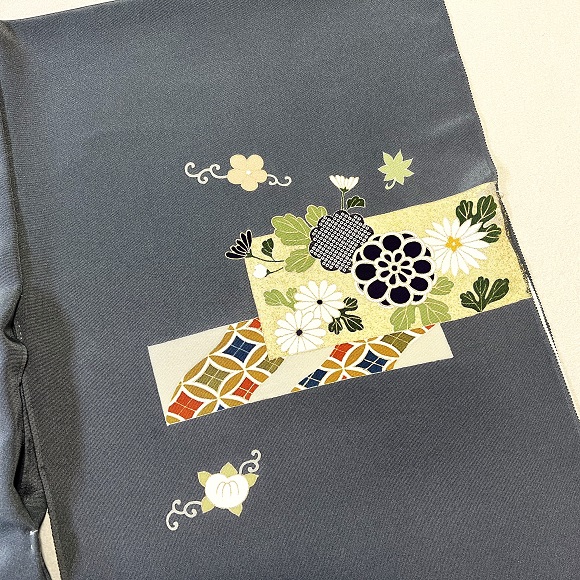 お馴染みの上質な白生地「凛」を藍鼠色に染め、色紙取りの中に有職文様や草花を配した付下げでございます。
