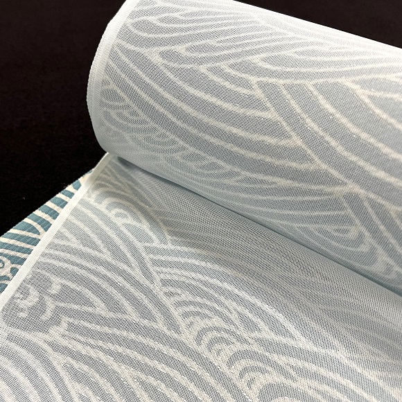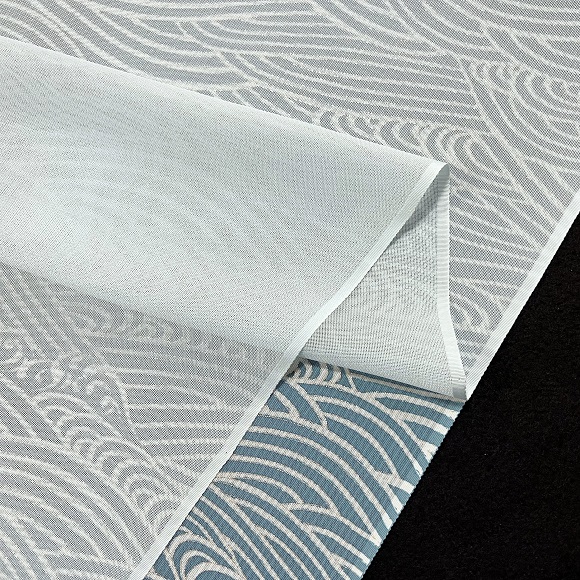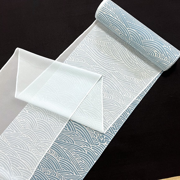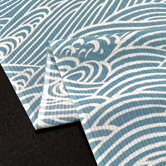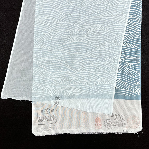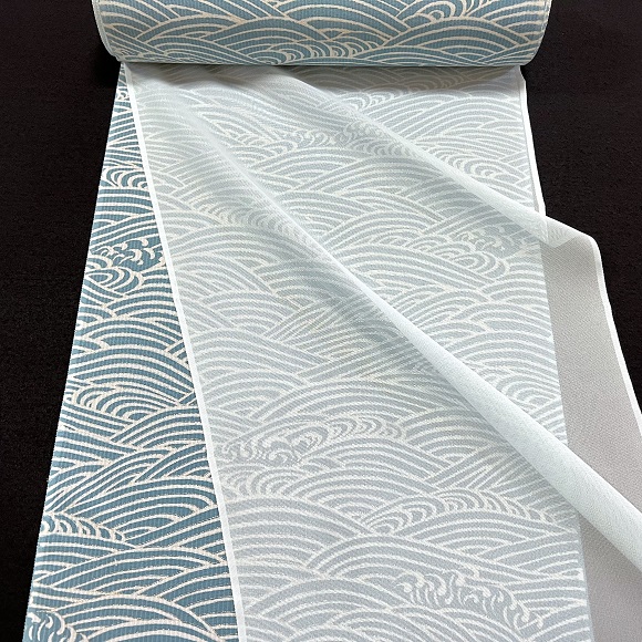 上質な長浜で織られた変わり織の紗の生地を使い、爽やかな青色を地色に白抜きで縁を銀糸目で表した波の文様の一方付けの小紋でございます。