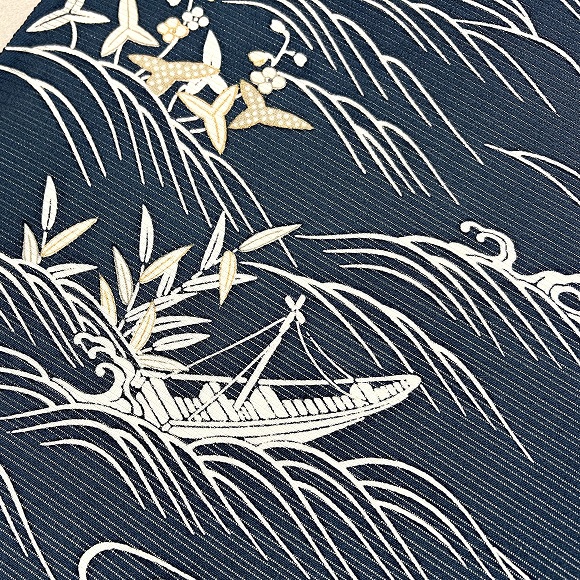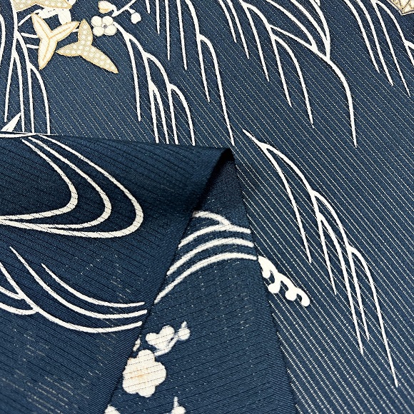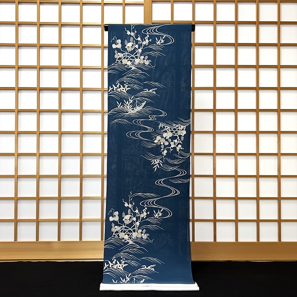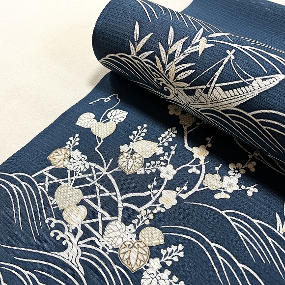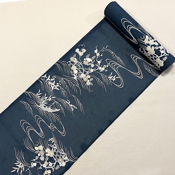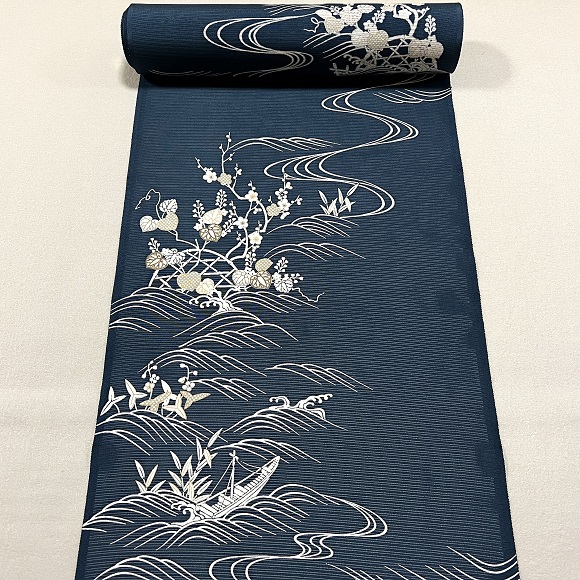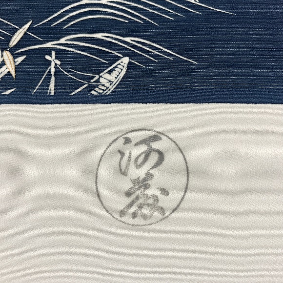 上質な河藤の絽縮緬にシックな紺青色に白抜きの水辺文様を表した小紋です。