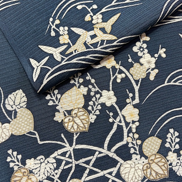 ポイント的に白抜きの葵や梅などに染疋田や落ち着いた金箔で縁取る工夫を凝らしております。