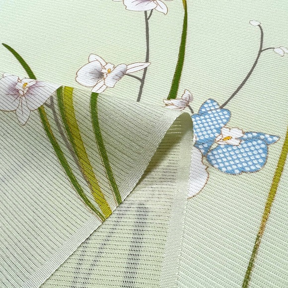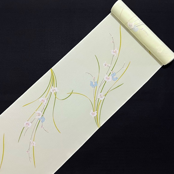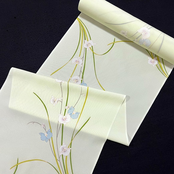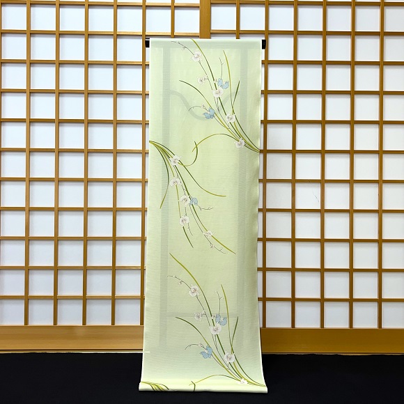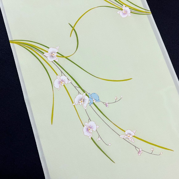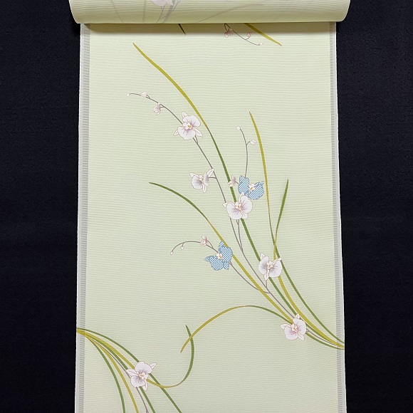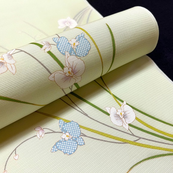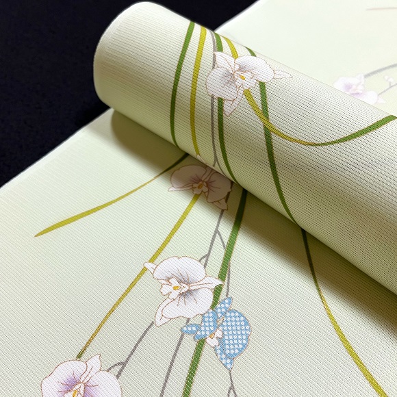 上質な五泉の駒絽を鶸色に染め、蘭を表した夏の小紋です。