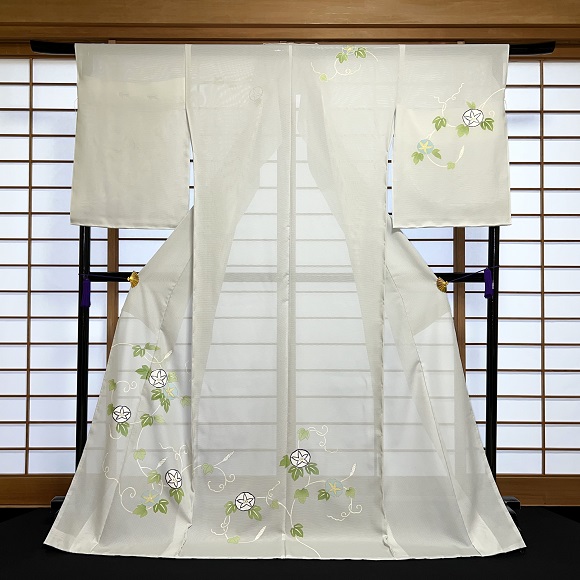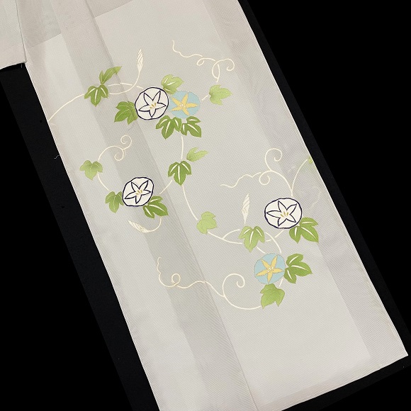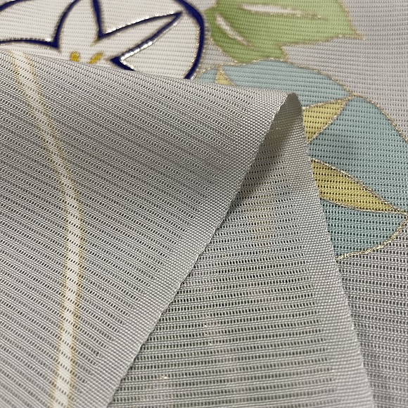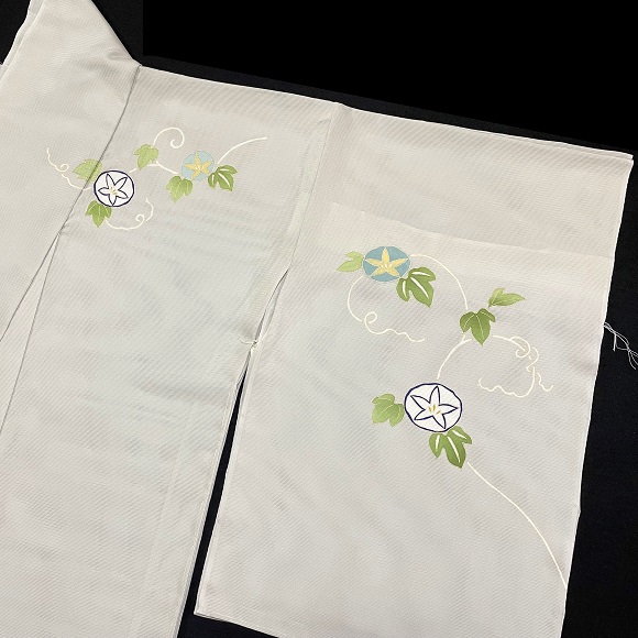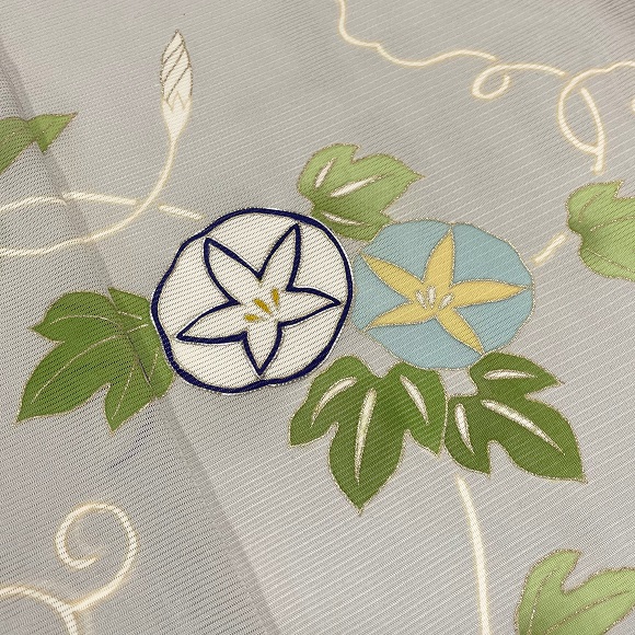 こちらの付下げは金糸目の手描きで表しており、上前の朝顔の花に銀駒刺繍を一つ入れて格調高さも表現しております。