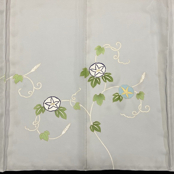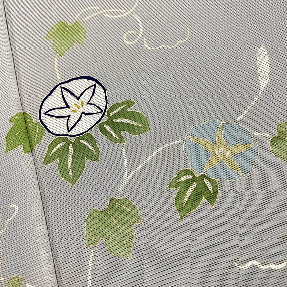 上質な五泉の駒絽を薄鼠色に染め、朝顔文様を配した付下げです。