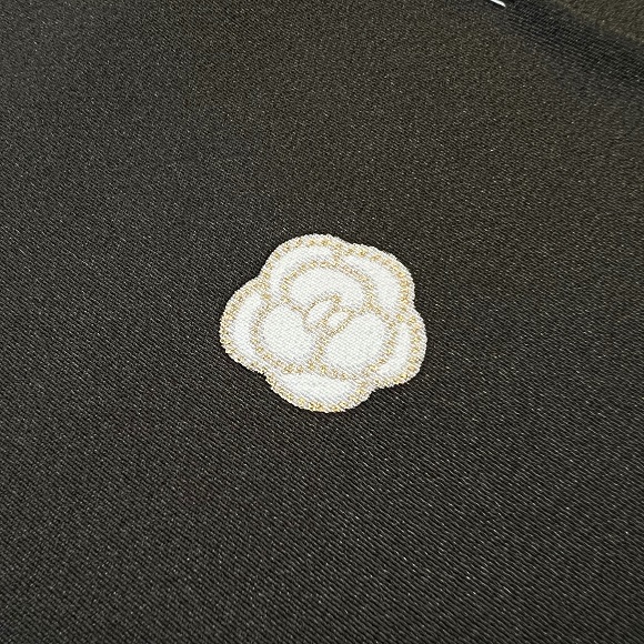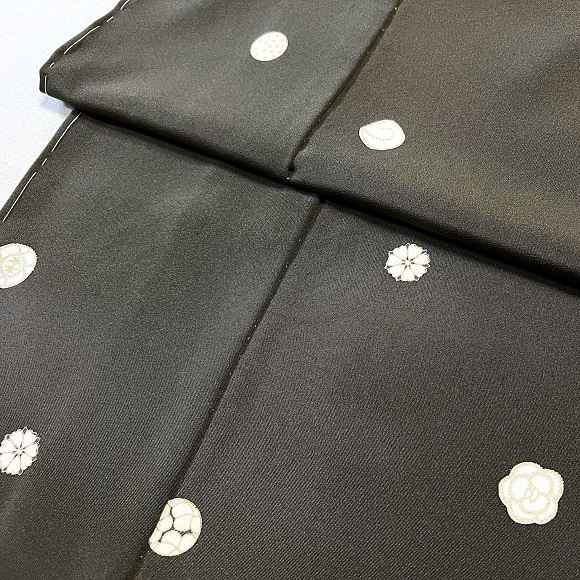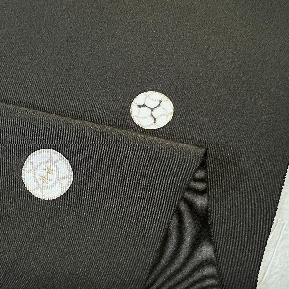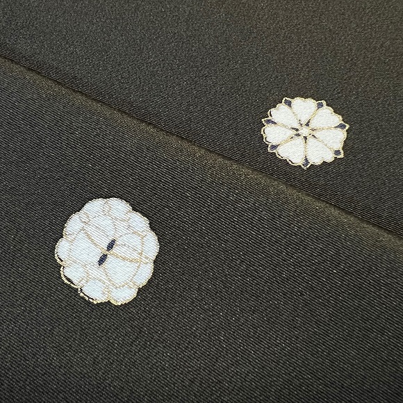 上質な浜ちりめんの白生地を焦茶色に染め、洋服のボタンの柄を散らした小紋です。