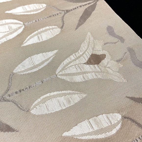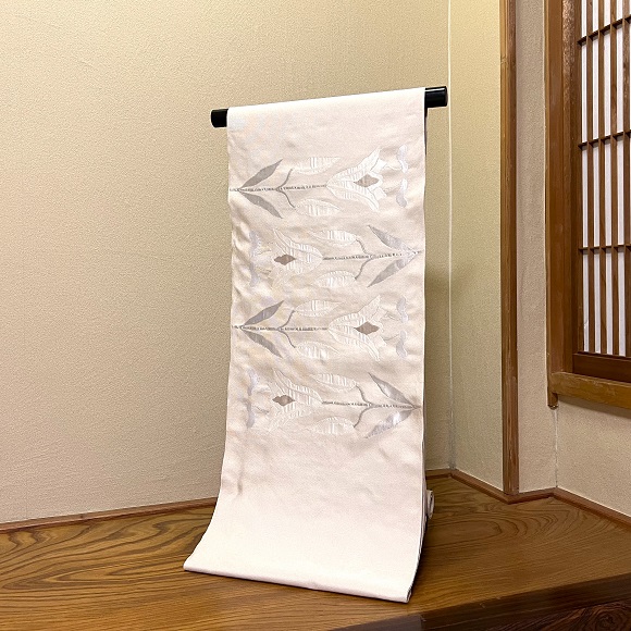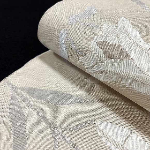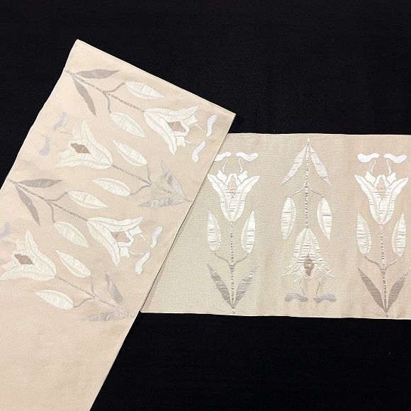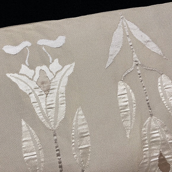 今回の百合文は、白茶地にグレージュ、薄茶、胡粉色で織り上げられたワントーン的な帯ですので、様々な色柄のお着物に合わせやすいのが嬉しいですね。