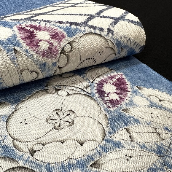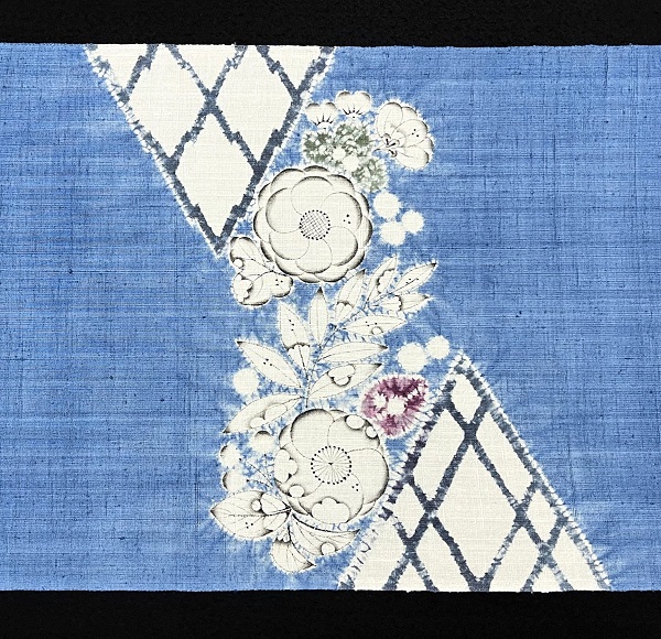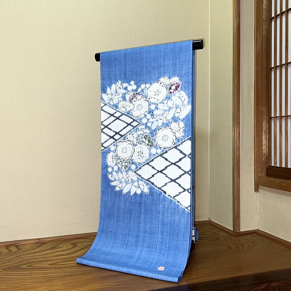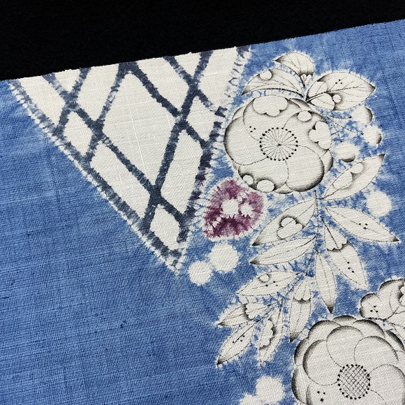 地色は落ち着いたお色の「青色」で、菱取格子の周りに墨描き(カチン)と絞りで表現された辻が花文様はいつも素晴らしい感動をいただけます。