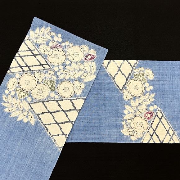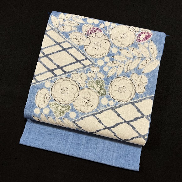 越後小千谷の真綿紬に辻が花を菱取格子に表したお洒落用の名古屋帯です。