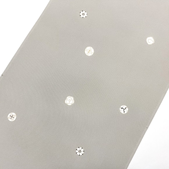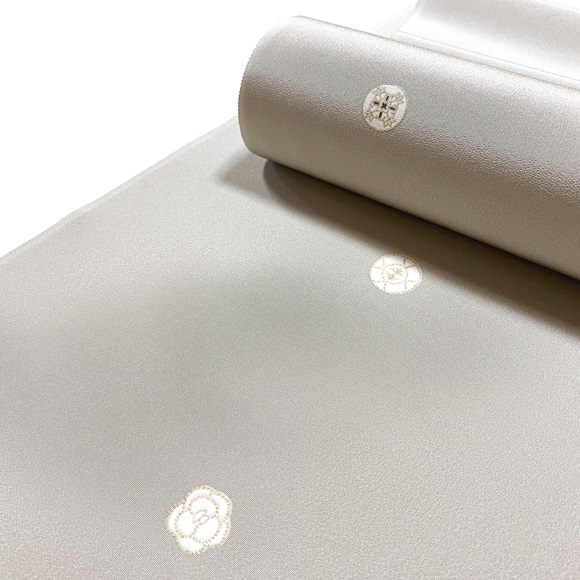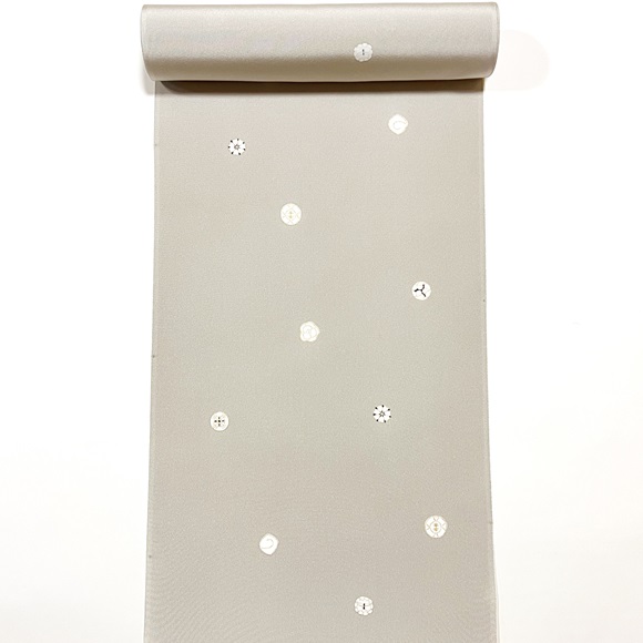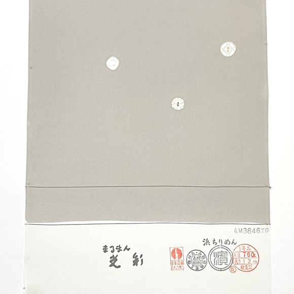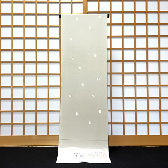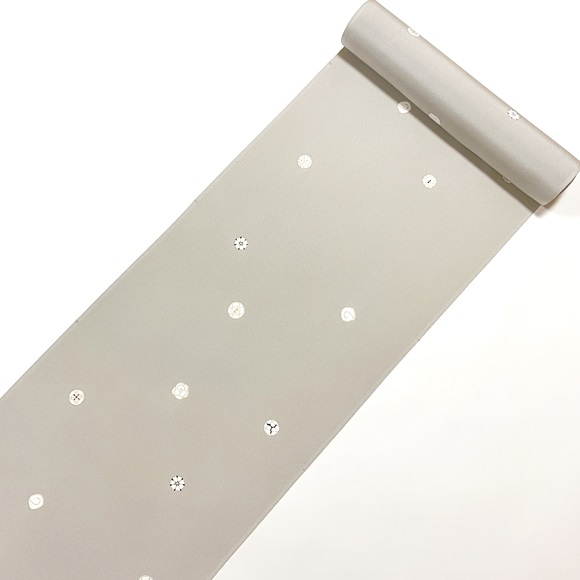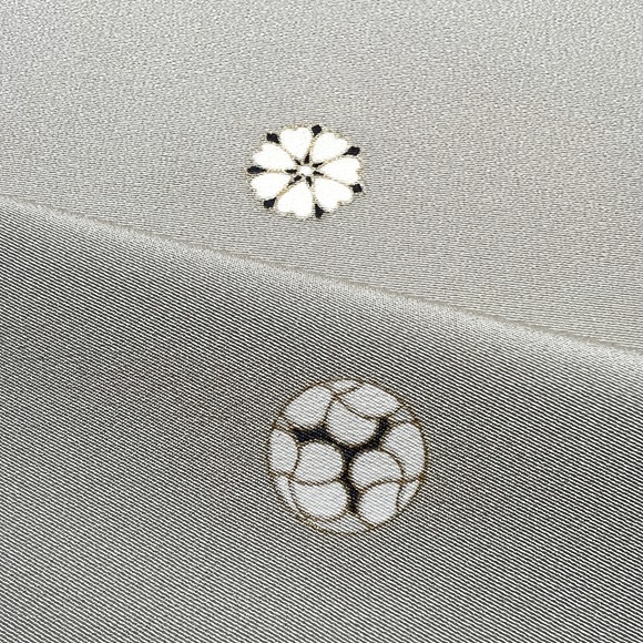 上質な浜ちりめんの白生地を薄鼠色に染め、洋服のボタンの柄を散らした小紋です。