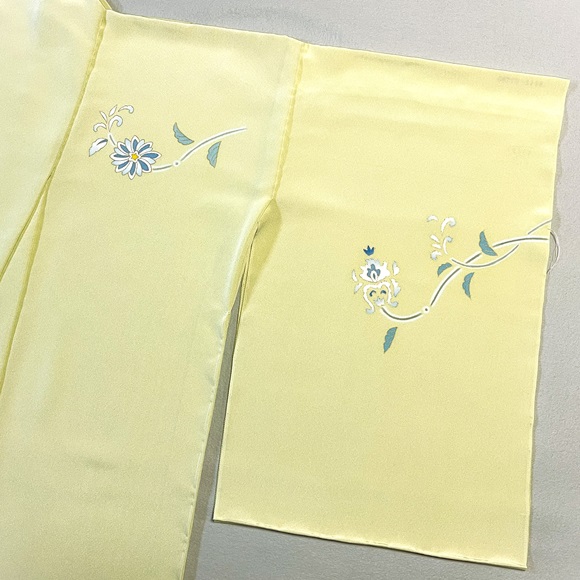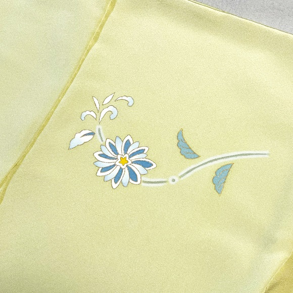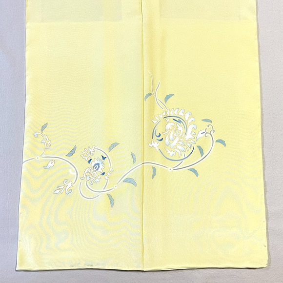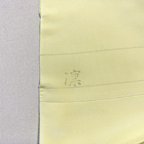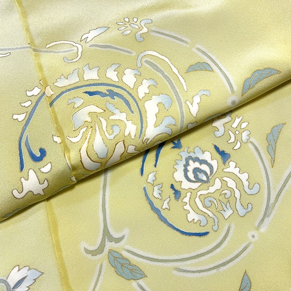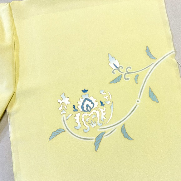 上質な白生地「凛」を黄色味が強い若草色に染め、正倉院模様の唐花を配した付下げでございます。