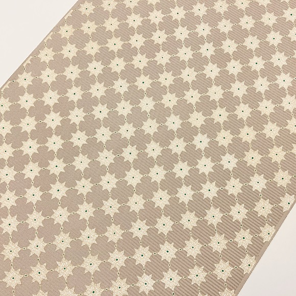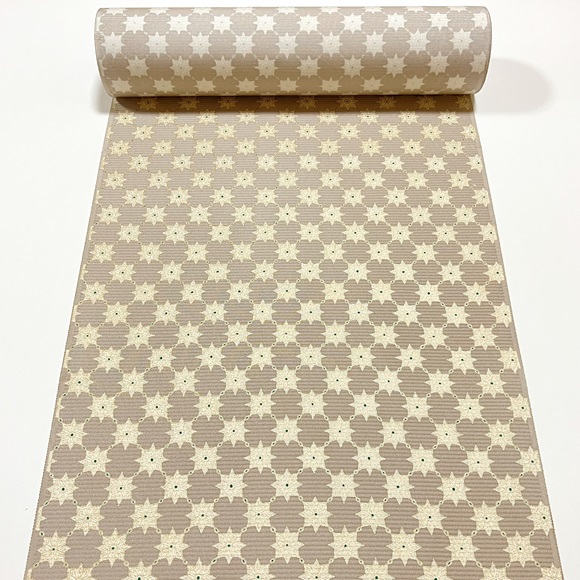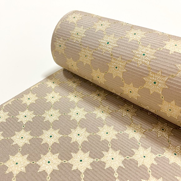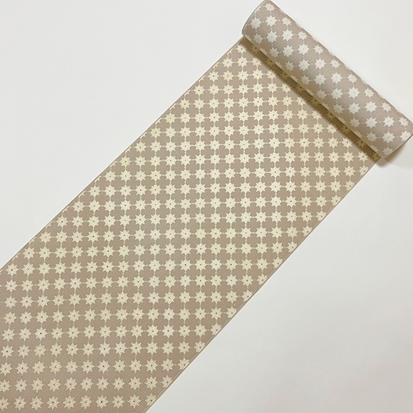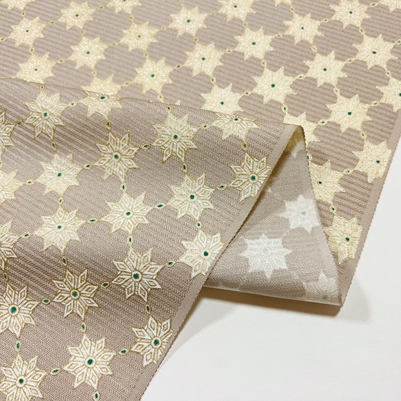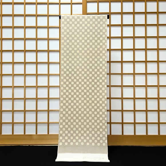 唐織横段という上質な白生地を薄茶色に染め、ダイヤモンドをイメージした柄を斜めに繋げた小紋です。