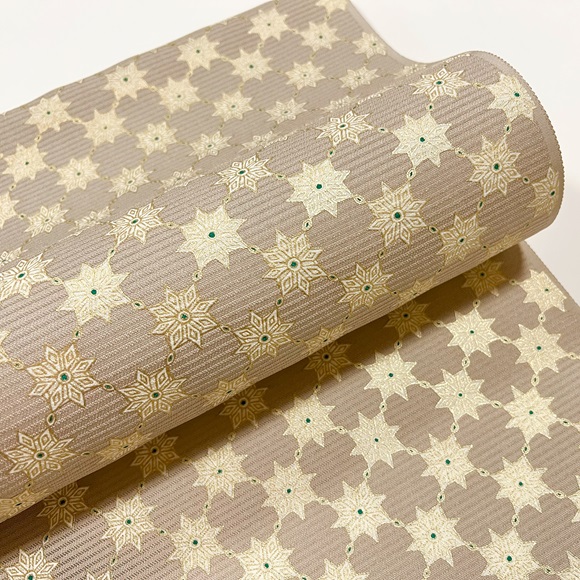 カットされたダイヤモンドをイメージして白地に金で縁取り表された文様でして、中心とつなぎ目にはアクセントとしてグリーンを入れております。