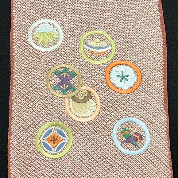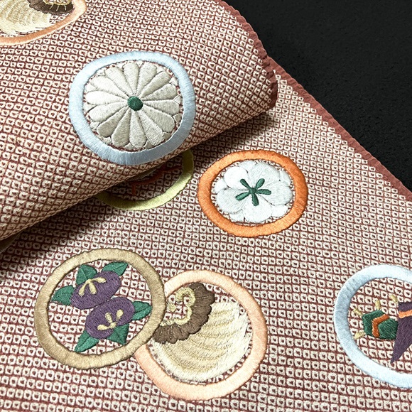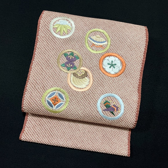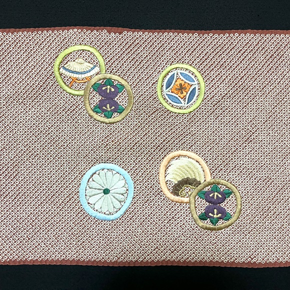 茶色の総絞り地に狂言の丸の刺繍を入れた名古屋帯です。