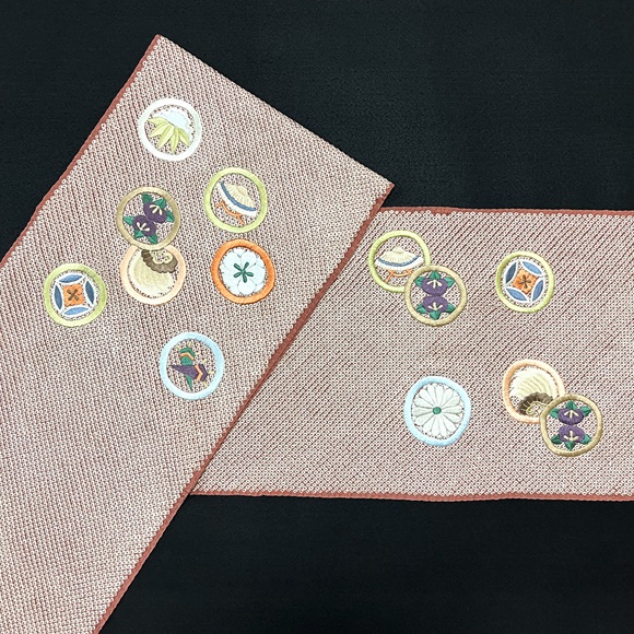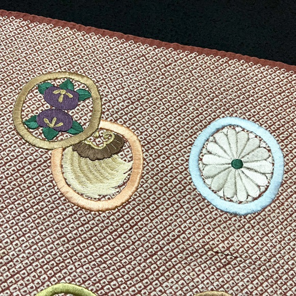 もちろん間違いでは無いですが、この名古屋帯は絞り染めの地色を茶色、そして刺繡もすべて落ち着いた色をつかっておりますのでシックな装いを楽しめます。