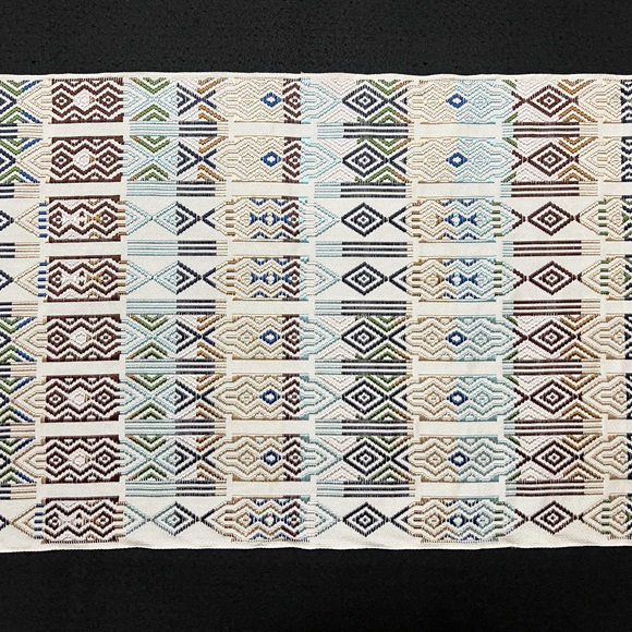 白よごし地に紺や水色、緑、茶系などで織り上げられたこの文様の彩色は、その時の織り手さんの感覚とセンスで微妙に変わるので、まさに一期一会の1本です。