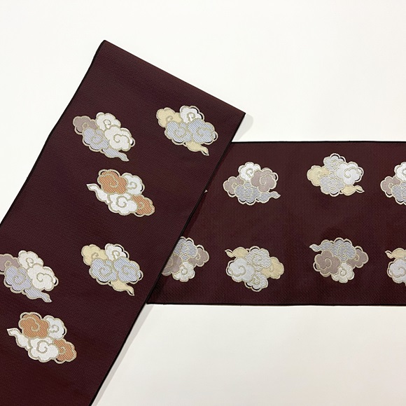 本日ご紹介致します商品は、洛風林の九寸名古屋帯「飛雲文(小菱濃紫)」でございます。