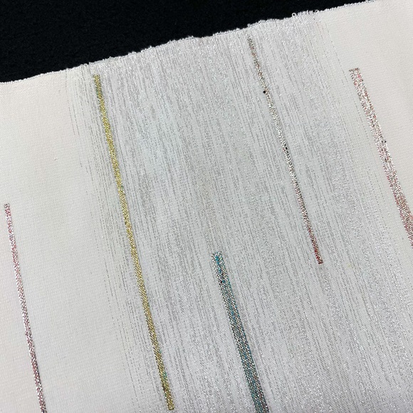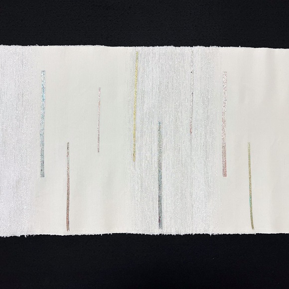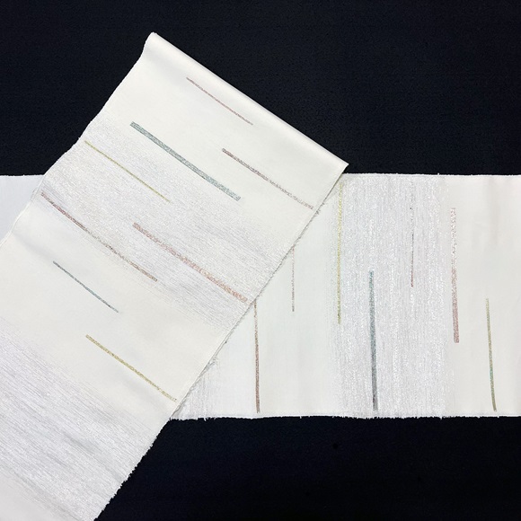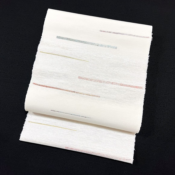 和紙がまかれ織り込まれた白の帯地に銀の霞とカラフルな箔段文を表した九寸名古屋帯です。
