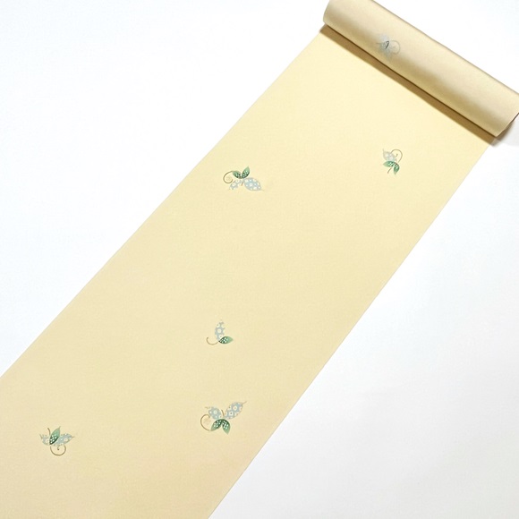 上質な浜ちりめんの白生地を薄黄色に染め、デザイン化した蝶々文様を散らした小紋です。
