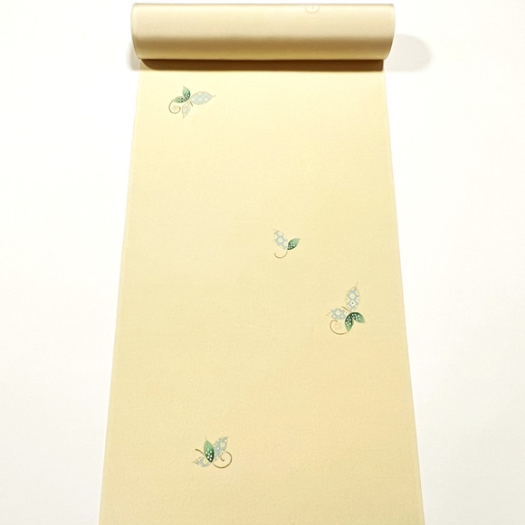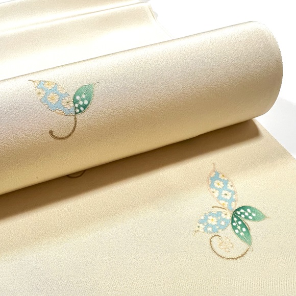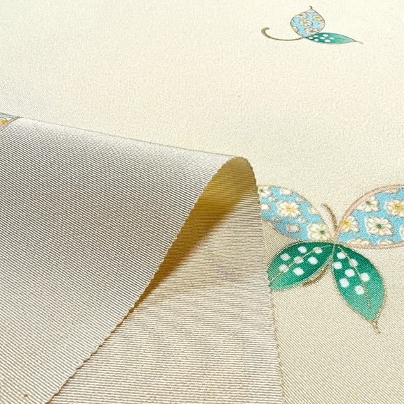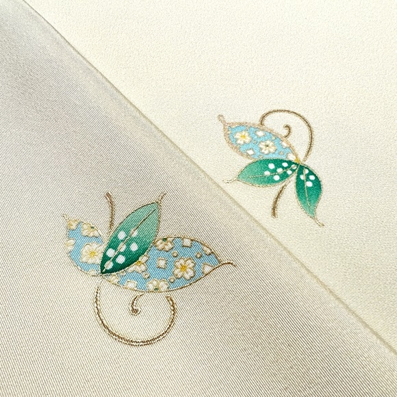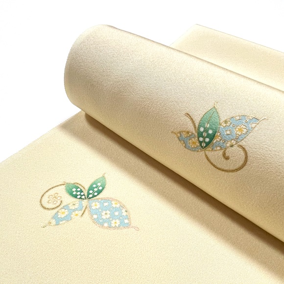 こちらはリアルな蝶々では無く、蝶々の様に見える図案化された葉っぱの中に小花文様をいれておりますので春に限らず秋でも冬でもお召いただけます。