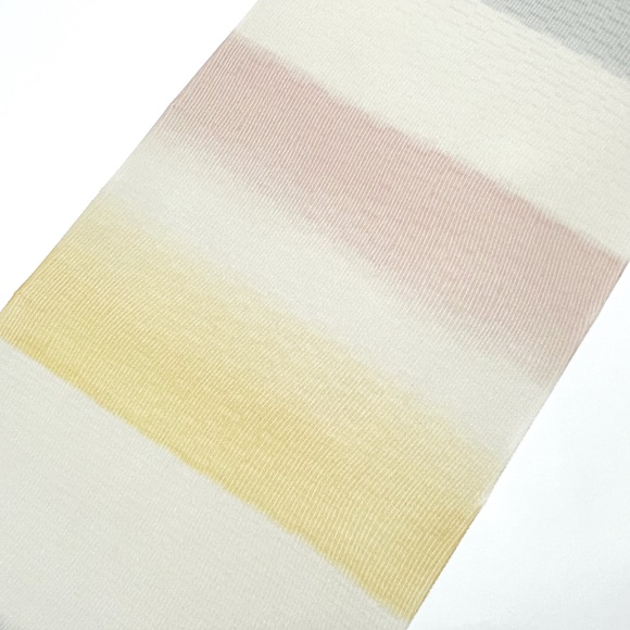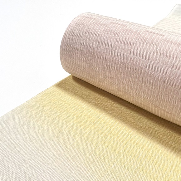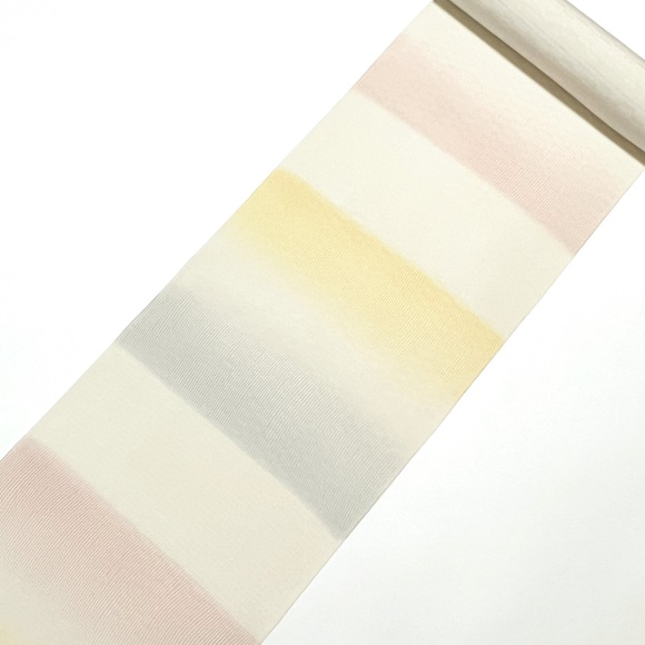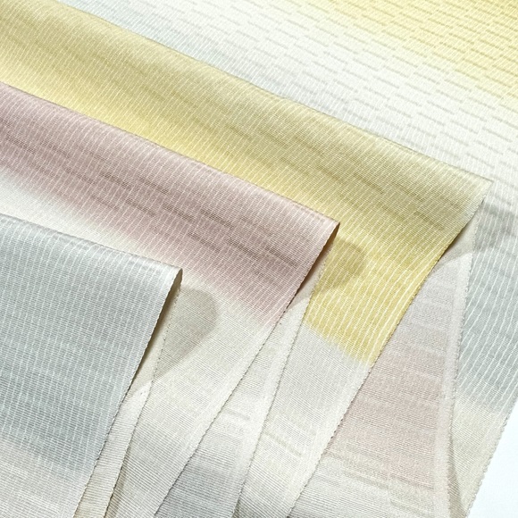 はんなりした配色の横段暈しとよく見ていただくと分かる細かいよろけ縞が特徴ですね。