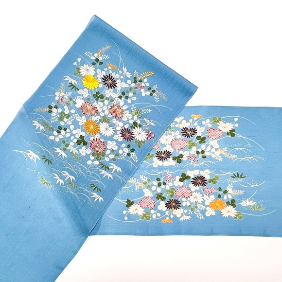本日ご紹介致します商品は、御所解き染刺繍 夏単衣名古屋帯「芒に菊萩(薄藍)」でございます。