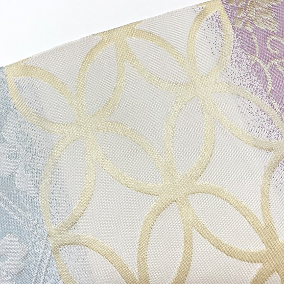 「名物裂集」と名付けられたこの帯は、花菱・七宝・桐唐草と代表的な名物裂の文様を横段に集めた上品な名古屋帯です。