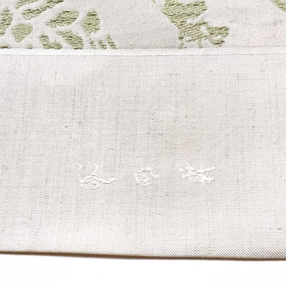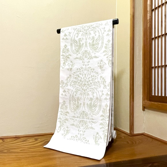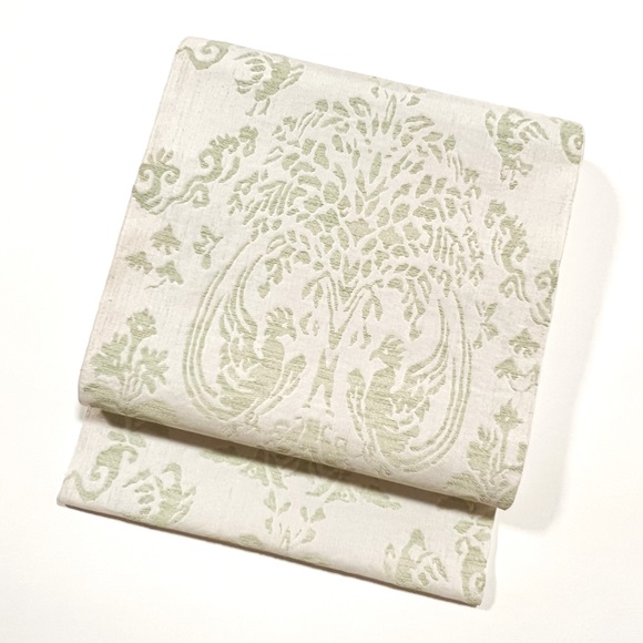 白よごし地に若葉色で花樹双鳳凰文を表しておりますので、シンプルでどんな色柄の着物にも合わせやすい名古屋帯です。