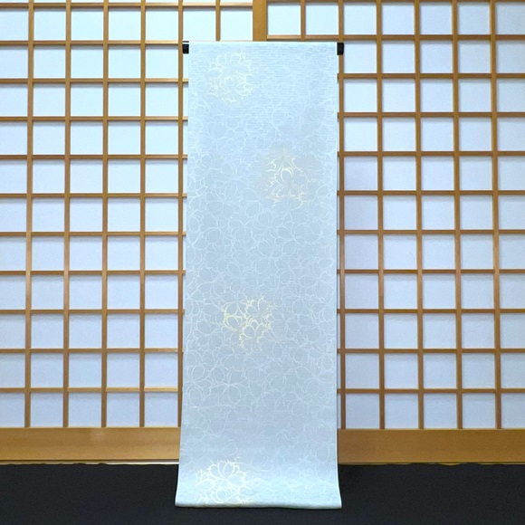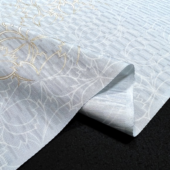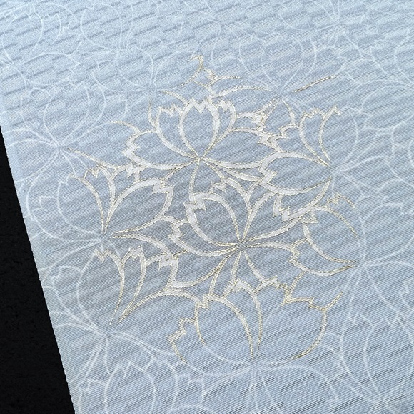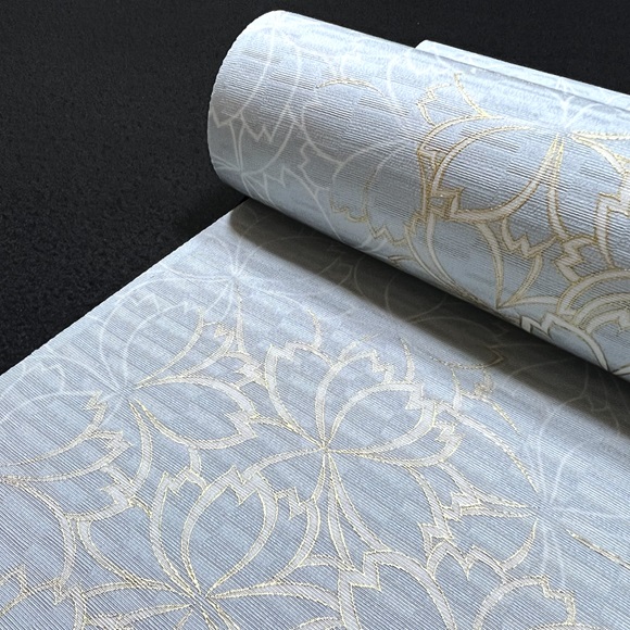 弊社お馴染みの上質な影織り地を使用し、薄空色地に糸目型で桜を表した総柄の小紋です。