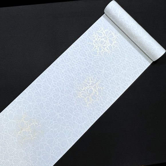 離れた所からは単色の落ち着いた小紋にみえますが、近くてみるとポイント的な金彩の華やかさと、線で表した桜のさりげない季節感の演出がとてもお洒落。