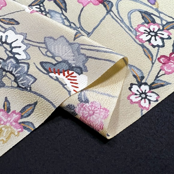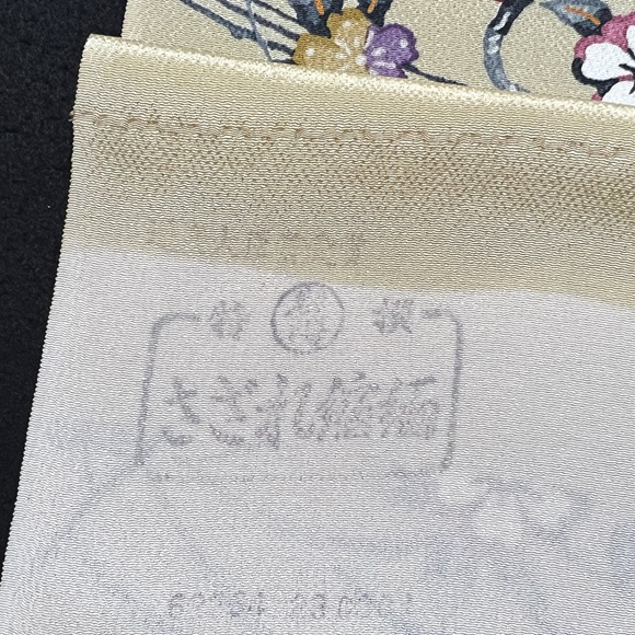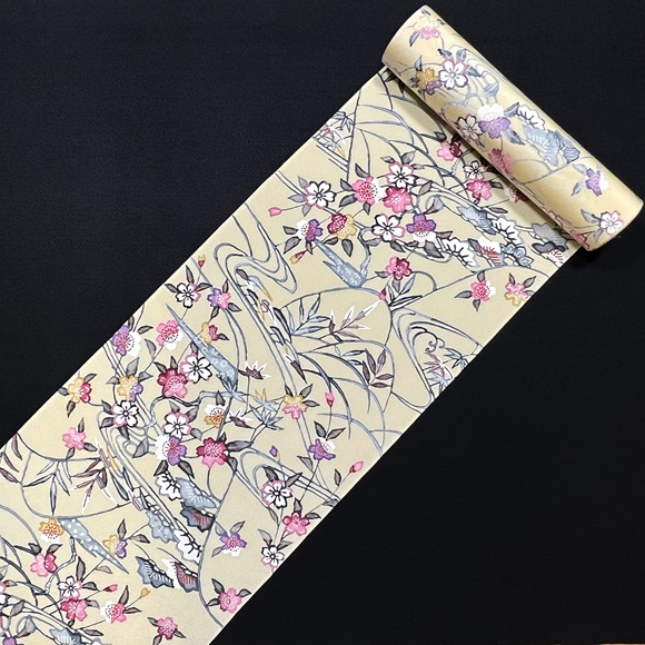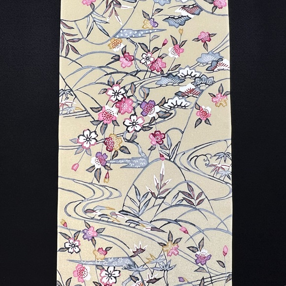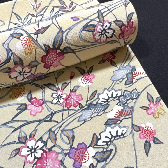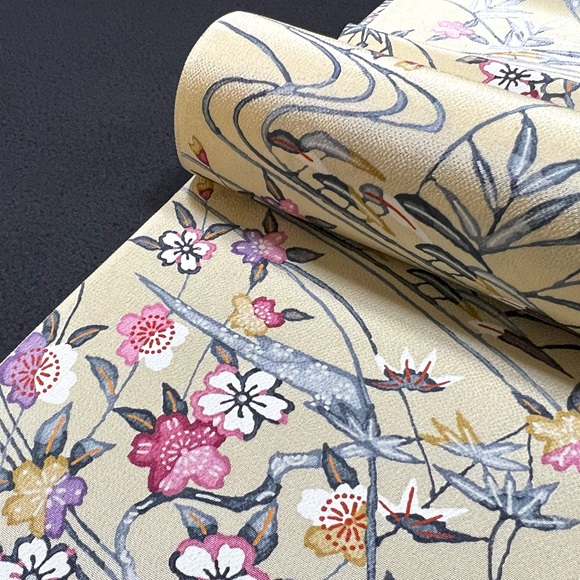 配色や図案を微妙に変えた「桜」がメインで、松やつゆ草で図案化された流水や遠山などが反物一面に表現されております。