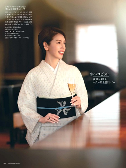 そしてホテル最上階のバーで夜景を楽しむ弊社おすすめの小紋と帯のコーディネートを、モデルの美香さんの着こなしで掲載しております。