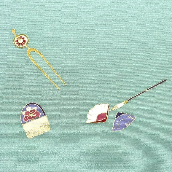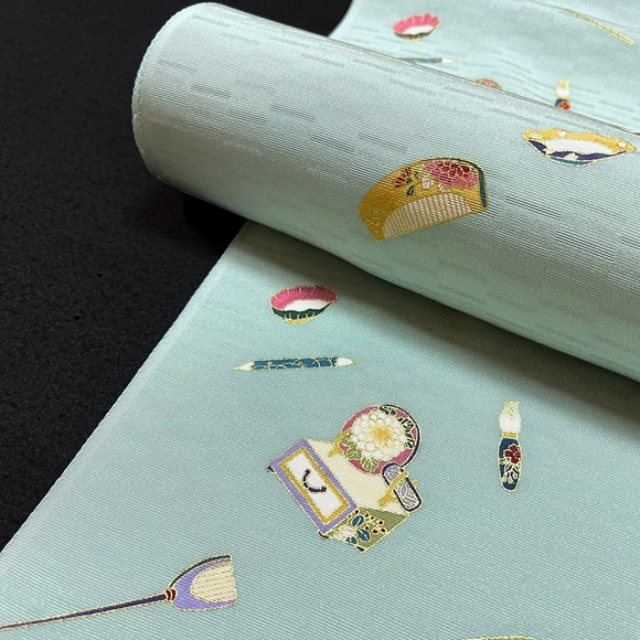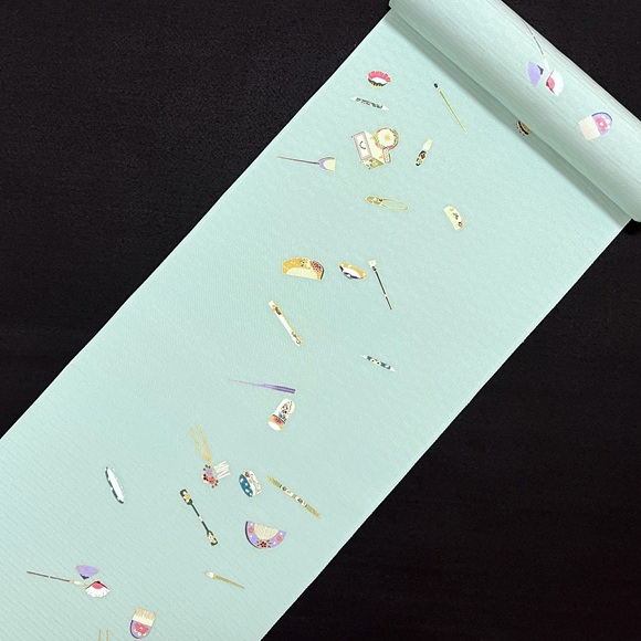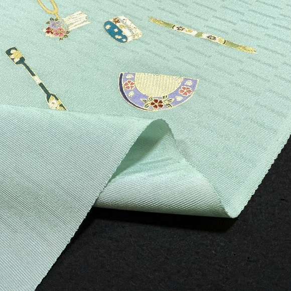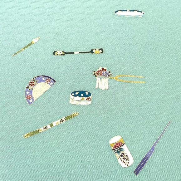 弊社お馴染みの上質な影織りの生地を青磁色に染め、身仕舞道具を散らした小紋です。