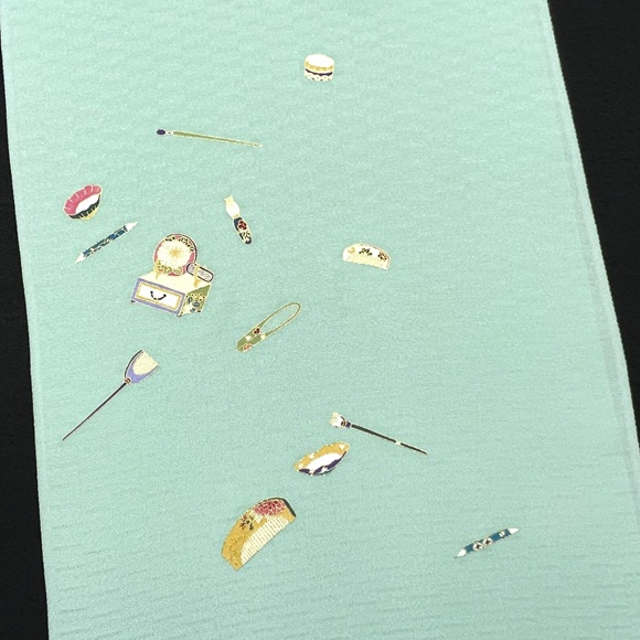 お化粧品やかんざし・こうがいなどの愛らしい身仕舞道具柄を金糸目で全て縁取り、手差しで彩色を入れておりますのでかなり手の込んだ小紋に仕上がっております。
