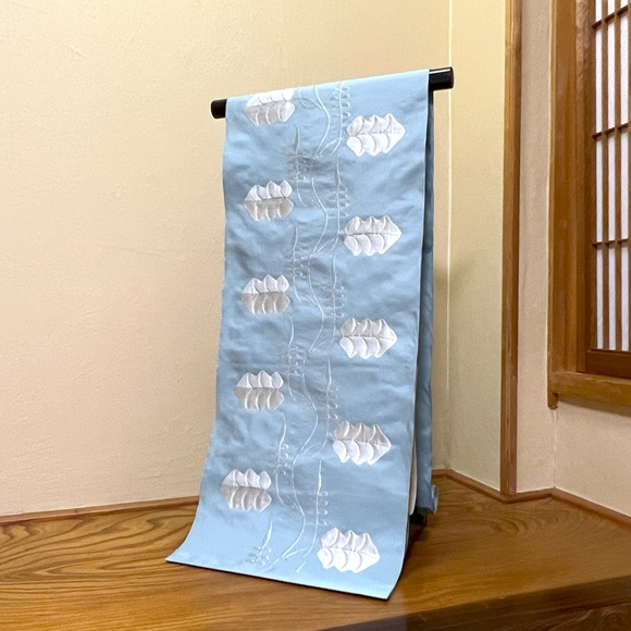 浅葱地に二色の煌めく銀で織りあげられたこの名古屋帯は透明感があり美しく、洛風林ならではの逸品でございます。