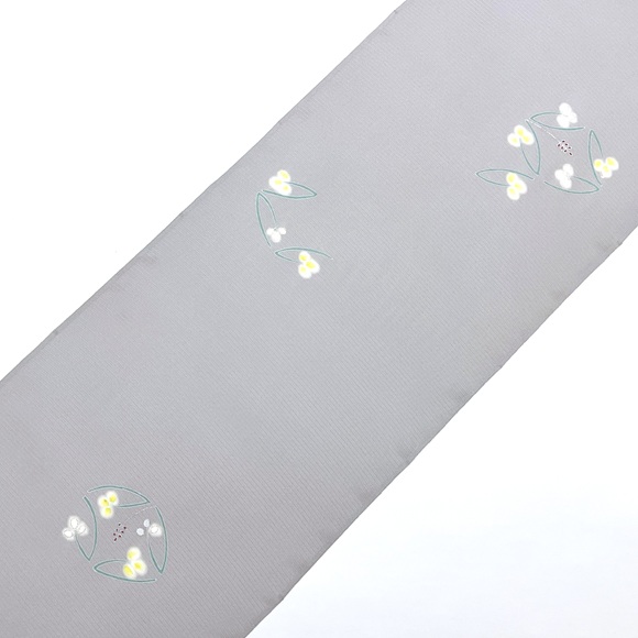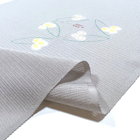 上質な河籐の絽ちりめんを薄鼠色に染め、萩と七宝文様を散らした小紋です。