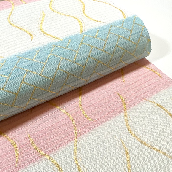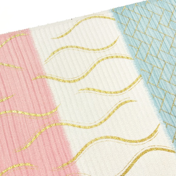 爽やかな桜色と水色の横段暈しの上に立涌文様と桧垣文様を金彩で表しております。