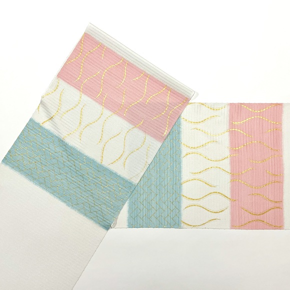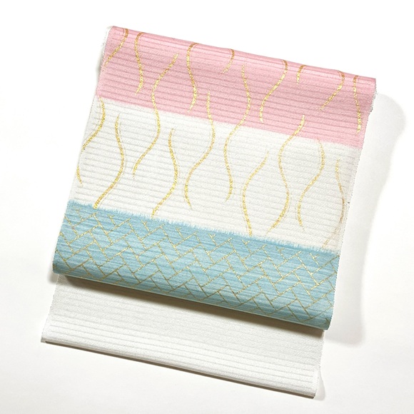 絽ちりめん立涌桧垣染名古屋帯「桜色×水色(白練地)」