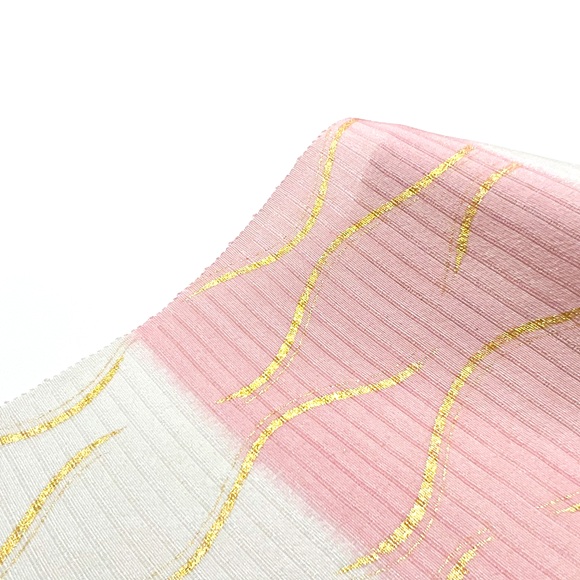 上質な絽ちりめんを白練色に染め、横段暈しと立涌・桧垣文様を金彩を入れた夏単衣名古屋帯です。