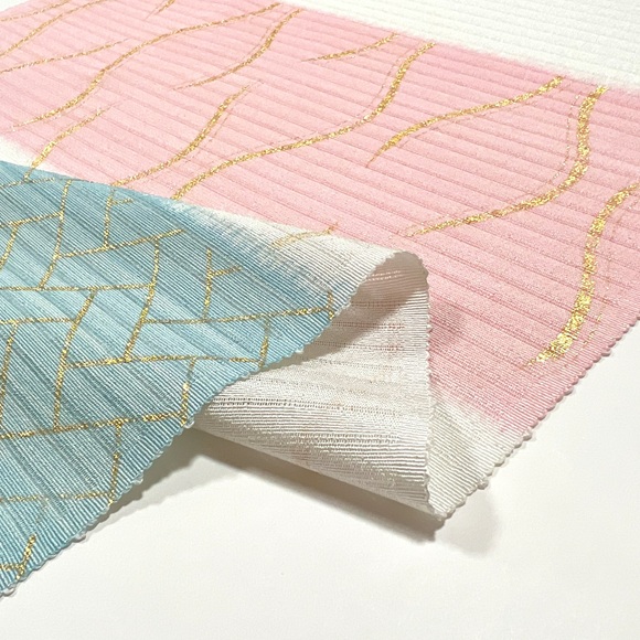 本日ご紹介致します商品は、絽ちりめん立涌桧垣染名古屋帯「桜色×水色(白練地)」でございます。