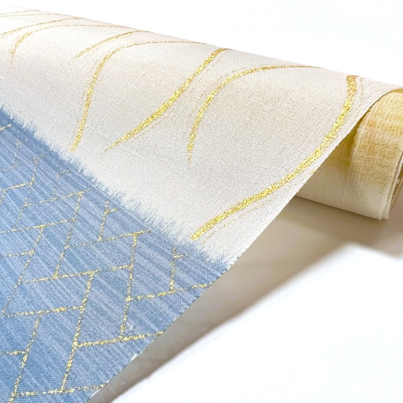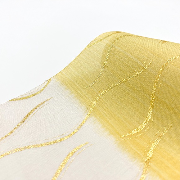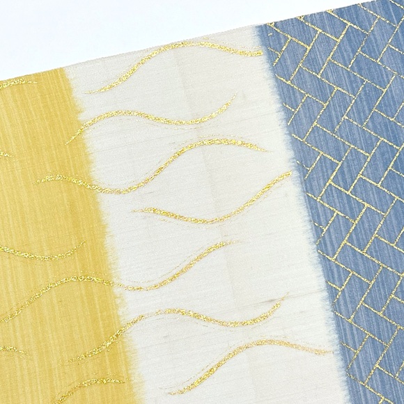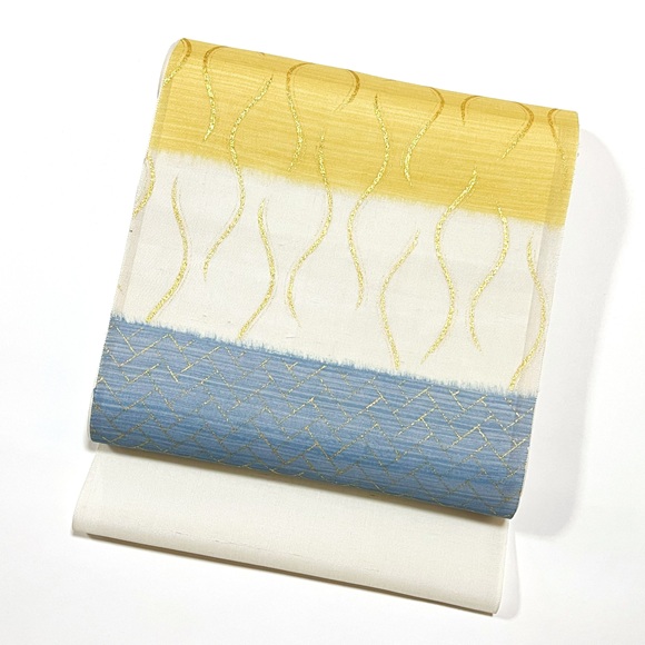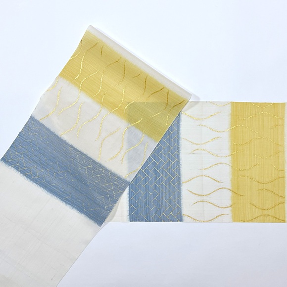 越後小千谷の上質な夏生地に、横段暈しと立涌・桧垣文様を金彩を入れた夏単衣名古屋帯です。
