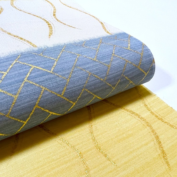 爽やかな黄色と青色の横段暈しの上に立涌文様と桧垣文様を金彩で表しております。
