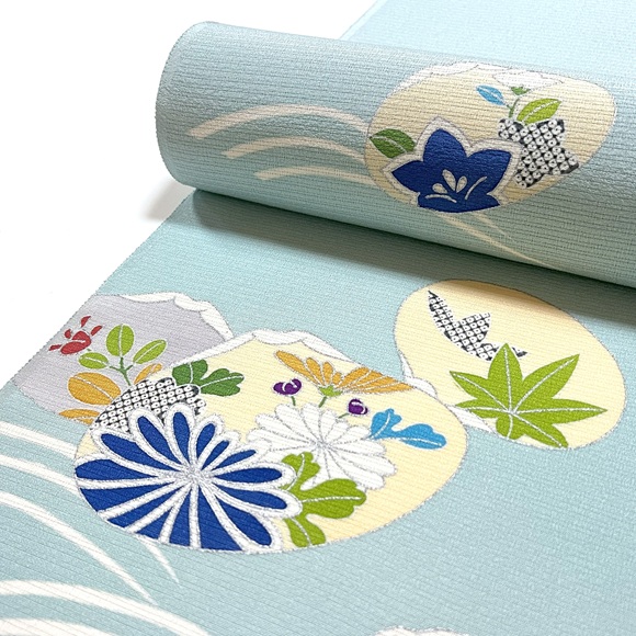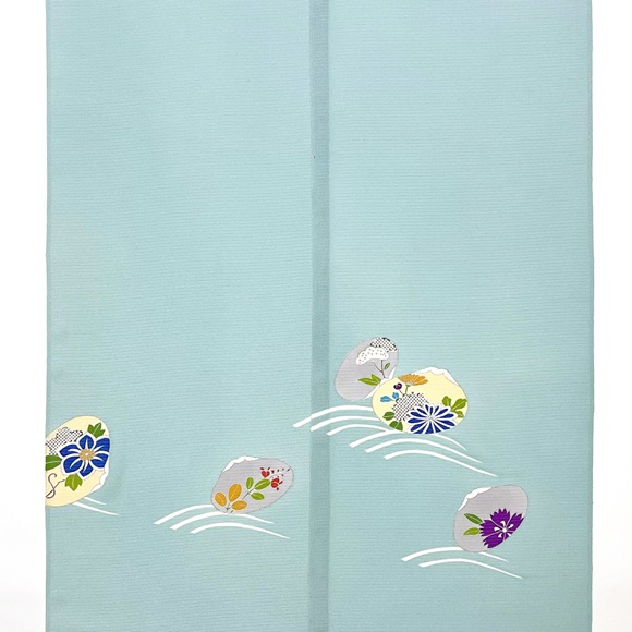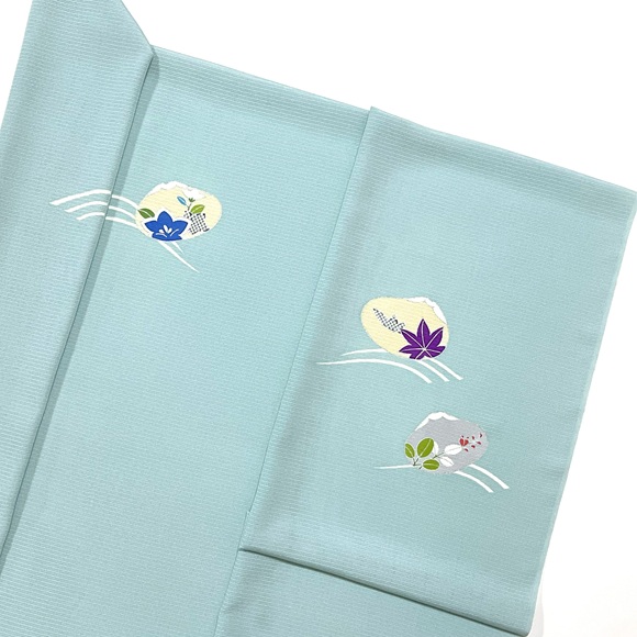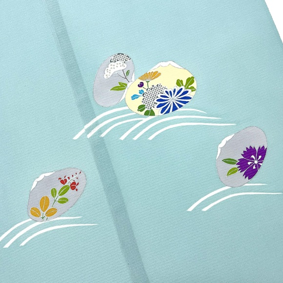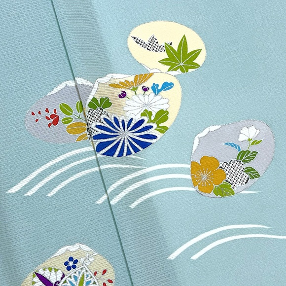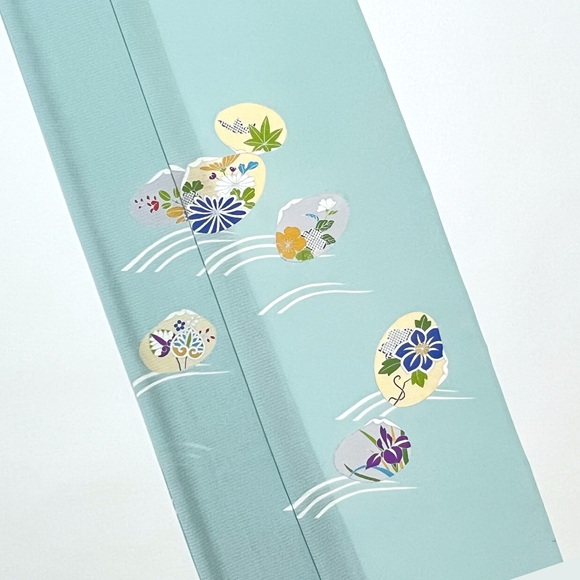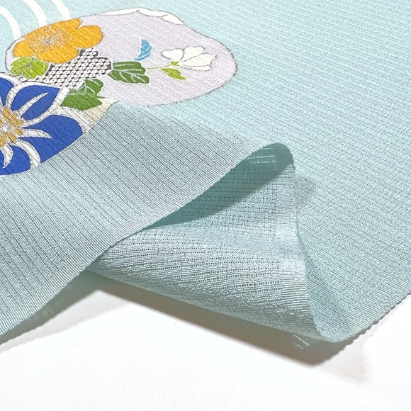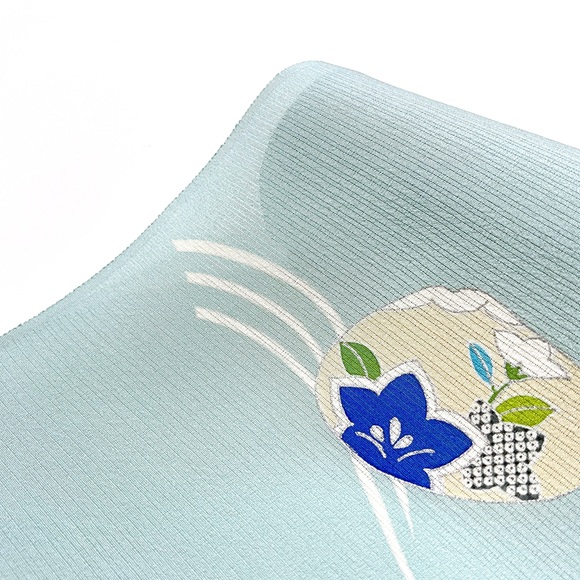 上質な絽ちりめんを水色に染め、波に貝合わせ文様を配した付下げでございます。