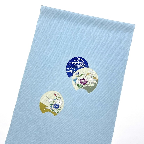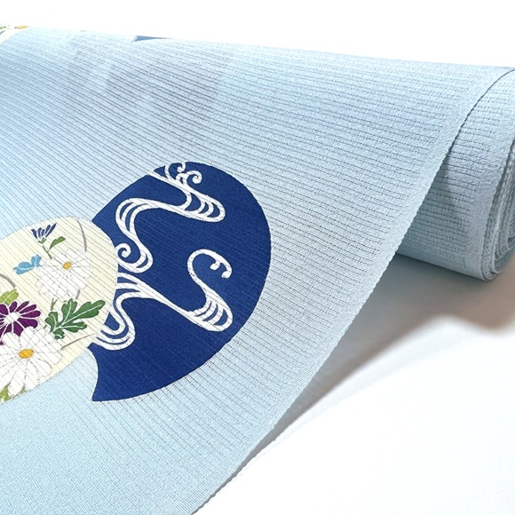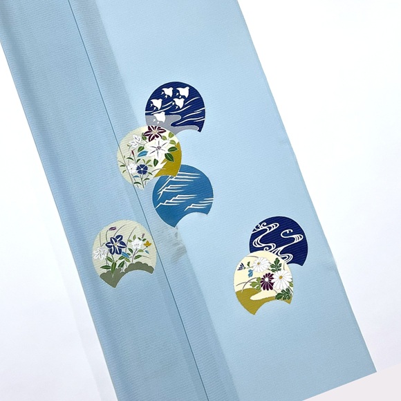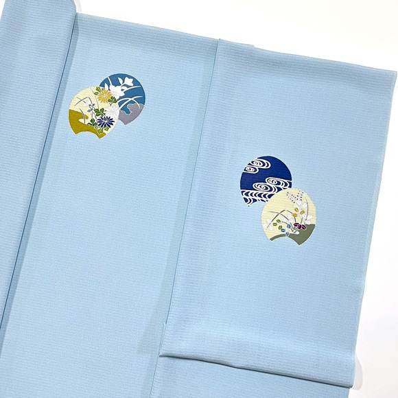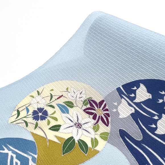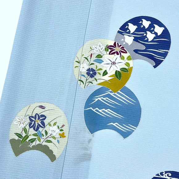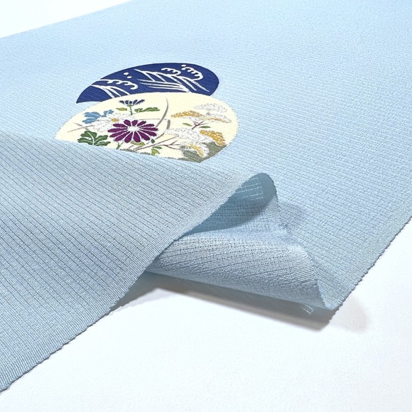 上質な絽ちりめんを水色に染め、団扇取りに夏花を配した付下げでございます。