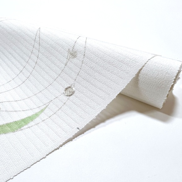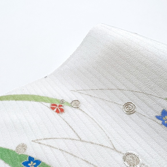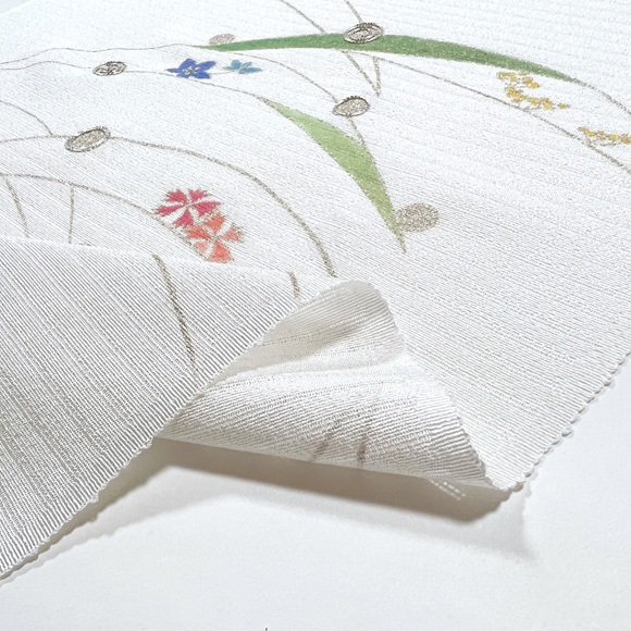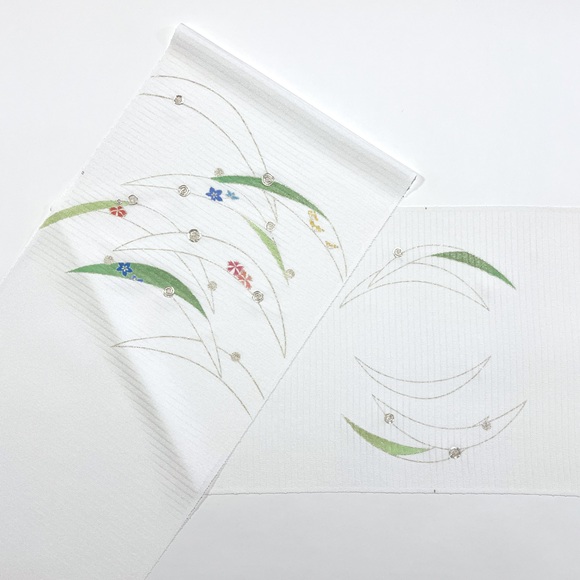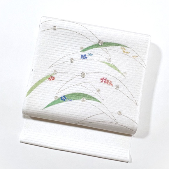 上質な絽ちりめんを黄変防止加工を施し、生地白に露芝文様を表した夏単衣名古屋帯です。